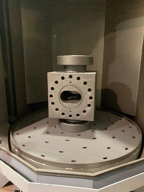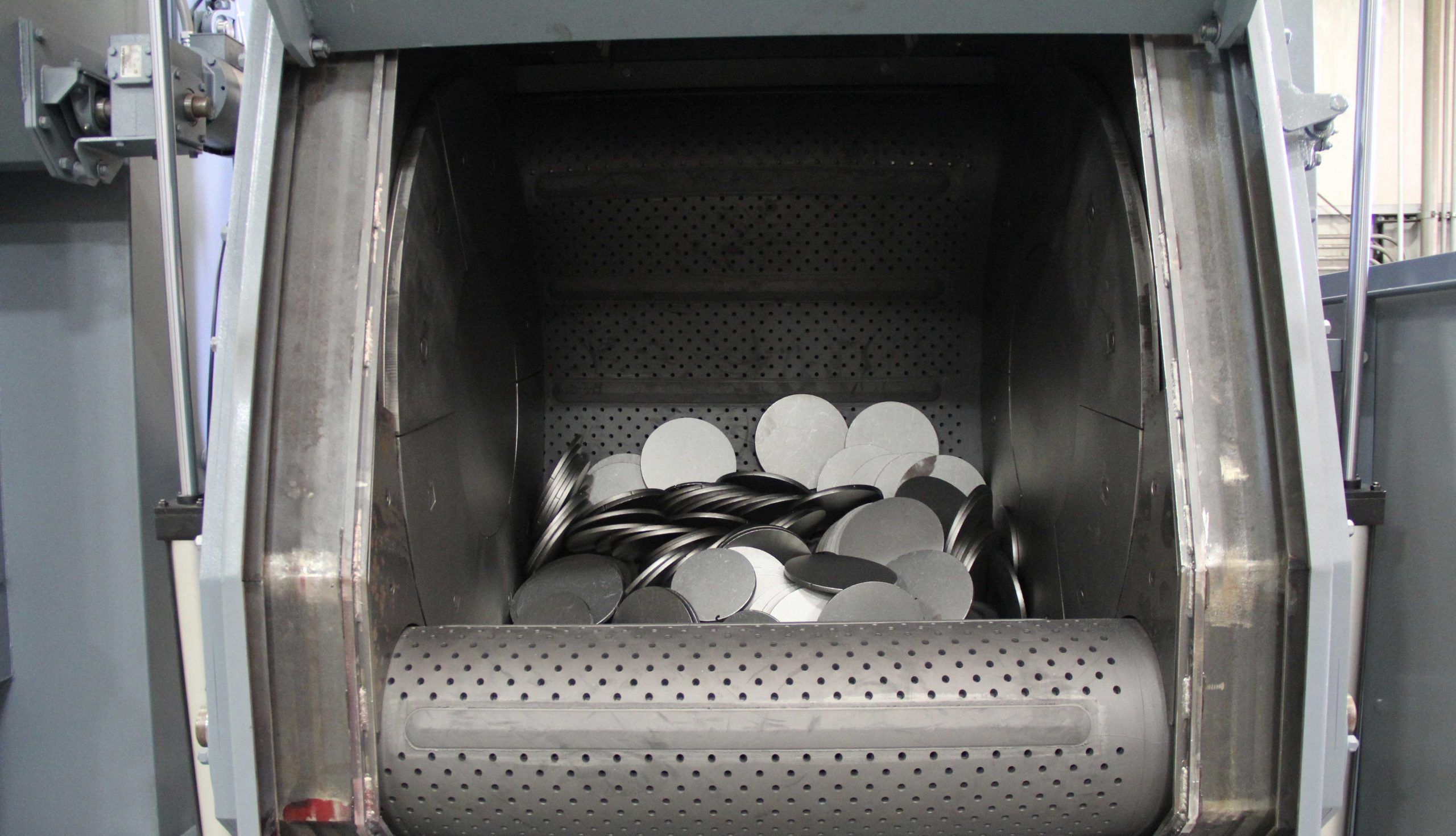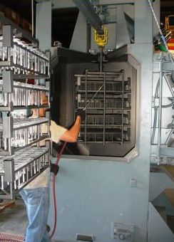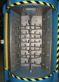 A means of blasting parts while hanging them on a fixture or tree. The fixture with parts on it will rotate while being blasted with one or more blast wheels that are typically mounted on the back or side of the cabinet. Dual chamber spinner hangers allow you to add/remove parts while the other side is blasting making it “as efficient as possible”. They also allow the chamber to index during blasting.