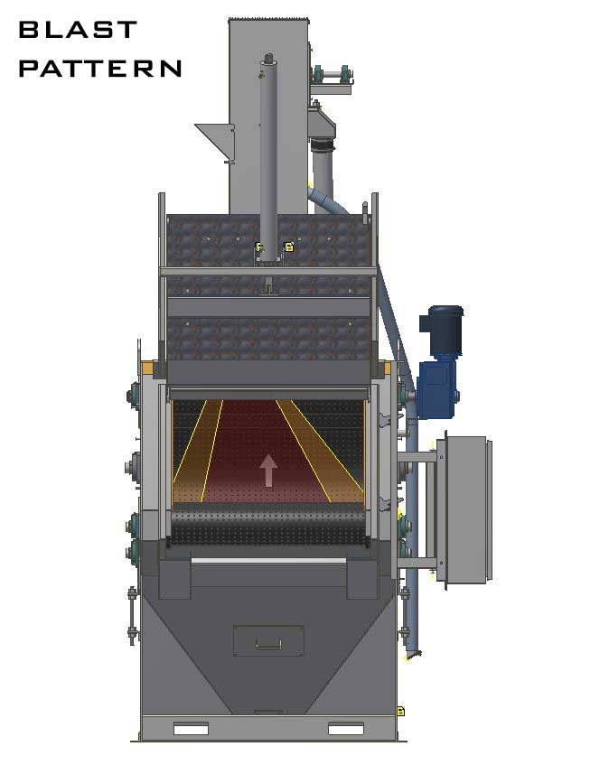 It’s a blast cabinet with typically one or two blast wheels aimed at an odd shaped or heavy part that is laying on a round table. The table rotates like a microwave turntable typically in a CCW direction when standing on it looking down. The reclamation system recovers the media using a bucket elevator recovery system that are sometimes assisted by an auger or two. They have an air wash separator to remove the fines.