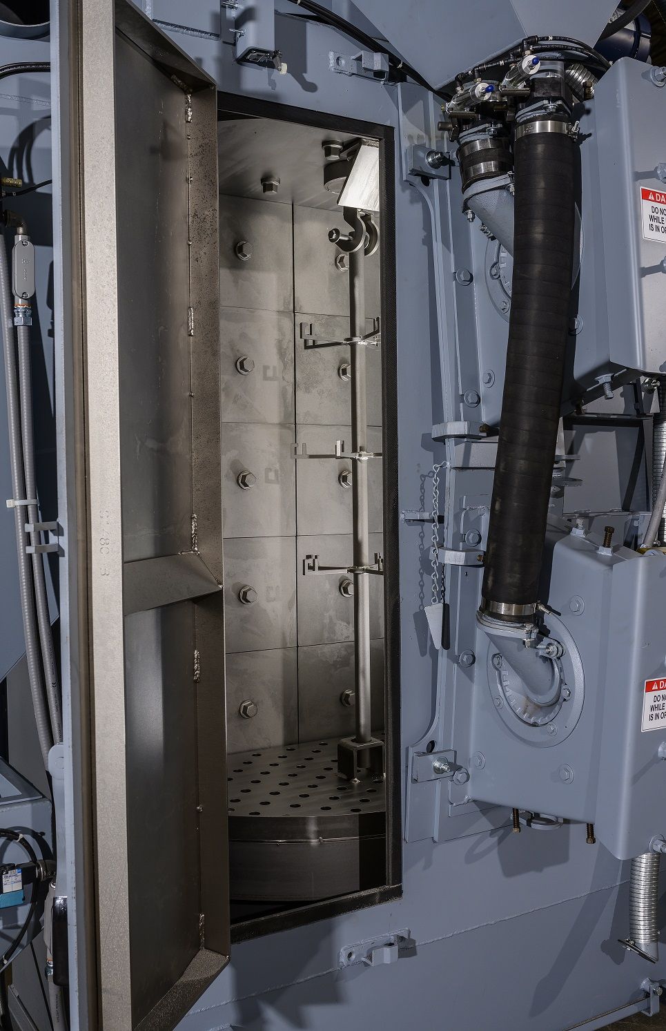 Our systems include two work chambers mounted on an indexing turntable. As the turntable steps through programmed positions, one chamber exposes parts to a contained blast stream emanating from high-efficiency wheels while the other opens to the operator, who loads and unloads parts from the un-contained chamber. To assure uniform coverage, a spindle rotates the hangers within the working chamber’s blast envelope.