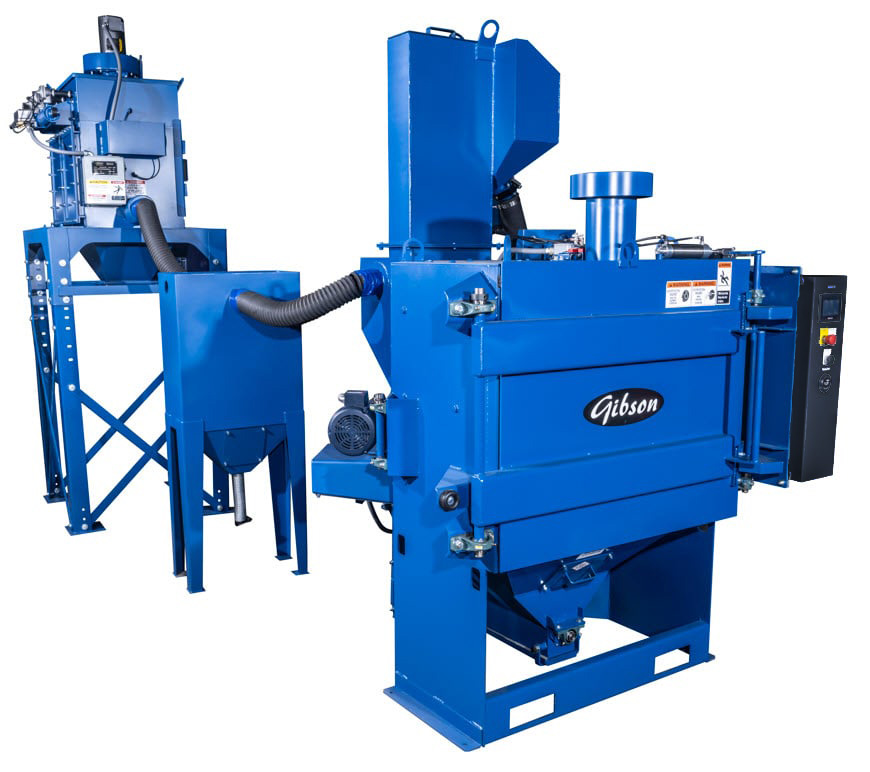 - These abrasive wheelblast machines use a powered turntable that rotates within the blast envelope to provide 360° exposure.