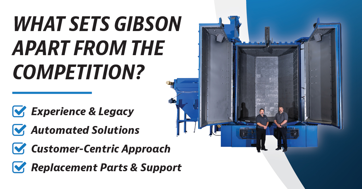 - Automated Solutions: Gibson specializes in fully automated blast systems designed for 24-hour production and easy integration into production flows, such as paint lines. This reduces labor costs associated with batch-type blasters.