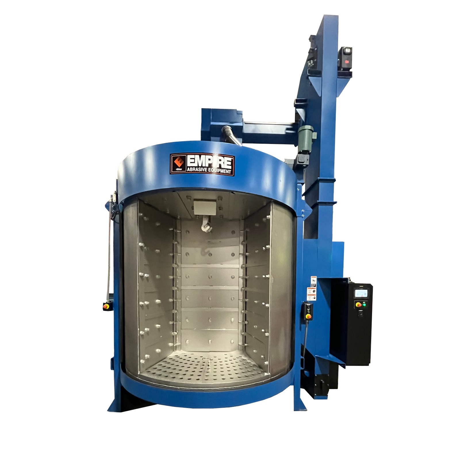- These systems have two work chambers mounted on an indexing turntable. One chamber is blasted while the other is open for loading and unloading.